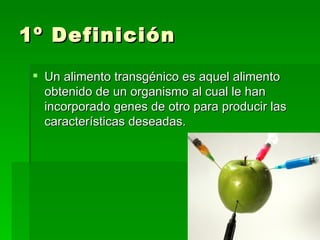 Este documento trata sobre los alimentos transgénicos. Explica que son organismos a los que se les han incorporado genes de otras especies para producir características deseadas. Describe brevemente los orígenes e historia de los alimentos transgénicos, desde los primeros experimentos en la década de 1980 hasta su comercialización a gran escala en la década de 1990. También discute algunos beneficios potenciales como la resistencia a enfermedades y plagas, así como algunos riesgos potenciales para la salud y el medio ambiente