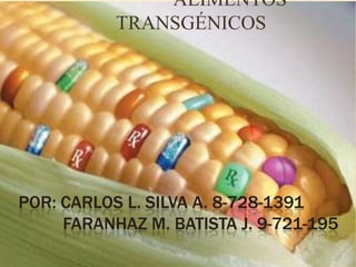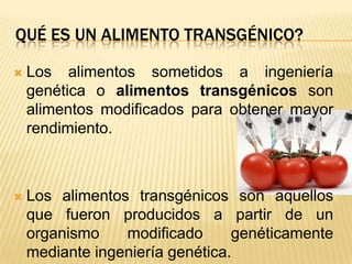 Este documento define los alimentos transgénicos como aquellos modificados genéticamente para obtener mayor rendimiento. Explica que en 1994 se aprobó el primer alimento transgénico pero fue retirado del mercado en 1996. Además, destaca que en 2006 la mayoría de la soya, el algodón y el maíz cultivados en EE.UU. eran transgénicos. Finalmente, resalta tanto las ventajas como las desventajas de estos alimentos en términos de su producción, conservación y riesgos medioambient
