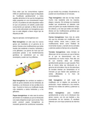 Este documento define los alimentos transgénicos como aquellos producidos mediante ingeniería genética, al insertar genes de una especie en otra para obtener características deseadas. Explica que los transgénicos más comunes son maíz, soja y trigo resistentes a plagas e insecticidas. También discute las ventajas de mayor productividad y calidad, pero las desventajas de contaminación ambiental, pérdida de biodiversidad y posibles riesgos para la salud como cáncer.