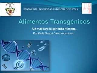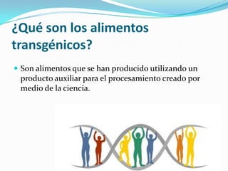 Este documento describe los alimentos transgénicos, sus objetivos y métodos de producción. Los alimentos transgénicos se han producido utilizando productos auxiliares creados por la ciencia para tener mayor vida útil, resistencia a plagas y mejores cualidades nutritivas. El método implica aislar el gen deseado e insertarlo en partículas que se incorporan a las células. Si bien estos alimentos pueden aportar nutrientes de forma rápida y cosechas más rápidas, también pueden causar enfermedades como el cán