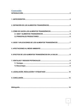 Este documento resume los principales puntos sobre los alimentos transgénicos. Explica cómo se crean mediante la introducción de genes de otros organismos, y los principales productores como Monsanto. También describe usos como la resistencia a plagas e insectos, y ventajas potenciales como mayor producción y resistencia ambiental. No obstante, señala posibles riesgos para la salud y el medio ambiente debido al uso de agroquímicos y la propagación de genes. El documento provee información básica sobre este tema complejo.