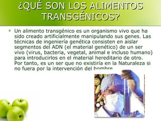 El documento define los alimentos transgénicos como organismos creados artificialmente mediante la manipulación genética para transferir genes entre especies. Menciona algunos ejemplos como el maíz transgénico cultivado en España que produce insecticidas naturales. Explica brevemente los pros y contras de los alimentos transgénicos y la situación actual de la agricultura intensiva, señalando posibles efectos negativos en el medio ambiente y la salud. Finalmente, comenta que empresas como Monsanto solicitan permisos para cultivos transgénic