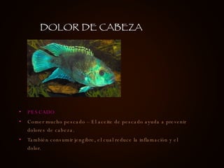 El documento proporciona recomendaciones sobre alimentos y su relación con diferentes afecciones de salud. Se mencionan los beneficios de consumir pescado, yogur, té verde, miel, cebolla, plátano, sandía, guayaba, papaya, tomate y otros alimentos para prevenir o tratar dolores de cabeza, fiebre, derrame cerebral, insomnio, asma, artritis, estómago revuelto, infección en la vejiga, huesos, falta de memoria, resfriados, úlceras,