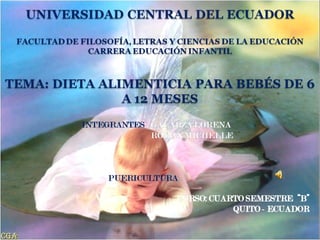 Este documento describe las recomendaciones nutricionales para los primeros doce meses de vida de un bebé. Se recomienda iniciar con frutas y vegetales como tomate y zanahoria a los seis meses, introducir cereales sin gluten a los siete meses, carnes blancas a los ocho meses, y huevo y derivados lácteos a los nueve meses, proporcionando los nutrientes necesarios para el crecimiento.