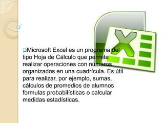 Este documento proporciona una guía sobre las funciones básicas de Microsoft Excel. Explica que Excel es un programa de hoja de cálculo que permite realizar cálculos numéricos y estadísticos. A continuación, describe las diferentes barras y herramientas de Excel, incluidas la barra de título, menú, herramientas, formato, fórmulas, etiquetas y desplazamiento. También cubre cómo insertar y administrar hojas, filas, columnas, celdas vacías y cómo imprimir y guardar archivos de Excel.