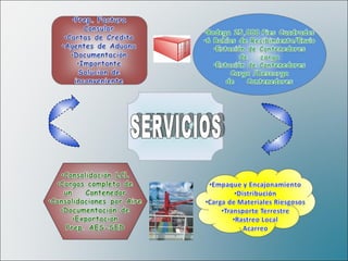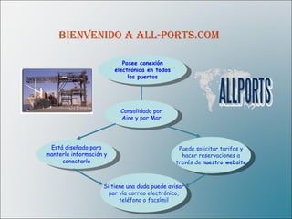 El documento presenta información sobre la compañía de transporte All-Ports.com, la cual ofrece servicios de transporte aéreo y marítimo entre los aeropuertos y puertos de Miami, Fort Lauderdale y los Everglades. La compañía busca mantener a los clientes informados y conectados a través de su página web, donde pueden solicitar tarifas y hacer reservaciones, además de ofrecer un servicio personalizado, flexible y rentable.