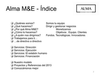 Alma M&E es un equipo especializado en dirección y gestión de negocios enfocados en la innovación, que trabaja con tecnologías y empresas en sectores como biotecnología y energías limpias. Ofrecen servicios de dirección interina, ejecución de proyectos, financiación y construcción de equipos, dirigidos principalmente a fondos de capital riesgo y empresas innovadoras. Su modelo se basa en la confidencialidad, la experiencia ejecutiva y la creación de alianzas estratégicas para monetizar tecnologías y facilitar el crecimiento empresarial.