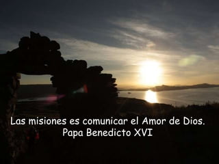 El documento habla sobre la importancia de las misiones de comunicar el amor de Dios a los demás. Pide ser llevado por Dios a consolar a los que sufren y están necesitados, tanto en lugares áridos como fértiles, extendiendo siempre la mano de la ayuda. Termina orando para aprender a amar sirviendo a los hermanos y dándoles no solo pan sino también amor compasivo.