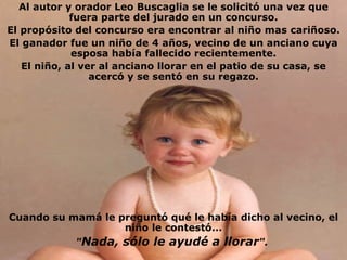 El documento presenta varias historias que muestran la bondad y compasión de niños hacia otros, como un niño que consoló a un anciano que lloraba la muerte de su esposa simplemente sentándose en su regazo y ayudándolo a llorar. También incluye la explicación de una niña adoptada sobre lo que significa ser adoptado y el acto de caridad de una mujer hacia un niño descalzo que le pedía zapatos a Dios frente a una tienda.