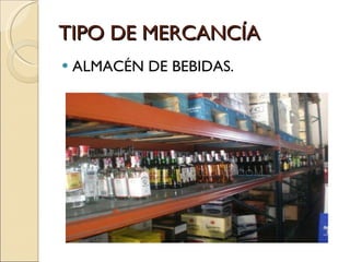Este documento resume el trabajo de almacenaje de bebidas llevado a cabo por Anaís Sagredo, Ivan Rubio y Carmen Morena. Describe que las bebidas almacenadas son líquidos embotellados a temperatura normal y clasifica los productos según su rotación mediante el análisis ABC para optimizar el almacenaje. Explica que las cargas se almacenan en palets flejados de 6, 8 o 12 unidades y que se usa un almacén convencional con palets apilados accesibles directamente.