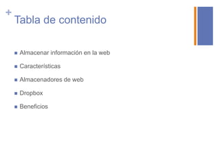 Este documento habla sobre el almacenamiento de información en la web a través de servicios como Dropbox, iCloud y SkyDrive. Explica que estos servicios permiten almacenar datos de forma segura en la nube y acceder a ellos desde cualquier dispositivo. También menciona que ofrecen características como sincronización automática entre dispositivos y cifrado de datos. Por último, resalta los beneficios de disponer de un espacio de almacenamiento en la nube accesible desde cualquier lugar.
