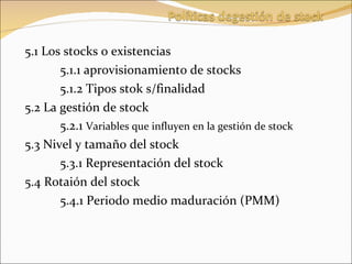 Una buena gestión de stock permite prever las ventas para lograr una producción eficiente y reducir costes de almacenamiento. La gestión de stock busca mantener los niveles adecuados para dar el máximo servicio al cliente al menor coste posible, teniendo en cuenta factores como la demanda prevista, plazos de entrega de proveedores y costes de gestión e inventario. Los stocks deben equilibrar la producción con las ventas para evitar excesos o faltantes que generen mayores costes o pérdida de clientes.