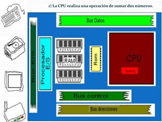 La CPU realiza una operación de suma de dos números y coloca el resultado en el bus de datos. Luego, el procesador de E/S informa al disco duro de una orden de escritura para almacenar el dato, coge el dato del bus de datos y lo envía al disco duro para su almacenamiento.