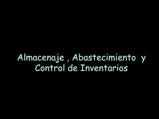 El documento habla sobre el almacenaje, abastecimiento y control de inventarios. Explica las funciones de los almacenes y las herramientas útiles para organizar y controlar inventarios.