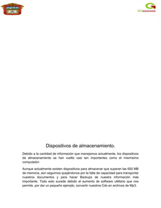 Este documento describe diferentes dispositivos de almacenamiento utilizados para almacenar grandes cantidades de información digital. Menciona que debido al aumento de datos, el espacio en el disco duro ya no es suficiente y se necesitan alternativas como almacenar archivos en la nube. También define los dispositivos de almacenamiento como componentes que leen y escriben datos en medios de almacenamiento secundario.