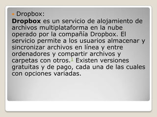 Dropbox es un servicio de almacenamiento en la nube que permite a los usuarios sincronizar y compartir archivos entre dispositivos de forma gratuita o paga. Los beneficios incluyen tener acceso a los archivos desde cualquier lugar, compartir archivos fácilmente con otros, acceder a los archivos desde aplicaciones móviles, y almacenar los archivos de forma segura sin necesidad de mantener copias de seguridad.