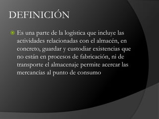 El documento aborda la importancia del almacenamiento en logística, destacando funciones como la protección de materias primas, el control de existencias y el acceso autorizado. Además, se analizan factores que influyen en la elección del sistema de almacenamiento y técnicas como el uso de racks y software de gestión de almacenes. Finalmente, se mencionan consultorías logísticas que ofrecen soluciones adaptadas a las necesidades de cada cliente.