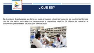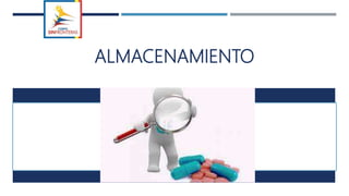 El documento describe las características de un área de almacenamiento de medicamentos y dispositivos médicos. Debe estar alejada de zonas contaminadas, facilitar la circulación, y contar con pisos, paredes y techos impermeables y fáciles de limpiar. También debe tener iluminación, ventilación y condiciones de temperatura y humedad adecuadas para conservar los productos correctamente. Los medicamentos deben almacenarse de forma organizada y segura según sus características.