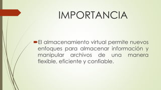 El almacenamiento virtual permite nuevos enfoques para almacenar y manipular archivos de forma flexible, eficiente y confiable. Permite compartir archivos dividiéndolos en carpetas públicas o privadas, de modo que los archivos en las carpetas públicas puedan ser descargados por cualquier persona a través de un enlace.