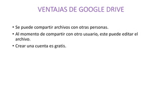 El documento compara las ventajas y desventajas de Google Drive y Dropbox para compartir archivos. Ambos servicios permiten crear cuentas gratuitas y compartir archivos con otros, aunque Google Drive tiene una capacidad más limitada y no requiere acceso a Internet, mientras que Dropbox requiere pago para obtener más capacidad y solo permite compartir una carpeta a la vez.