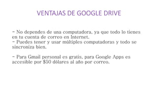 Este documento resume las ventajas y desventajas de Google Drive y Dropbox. Entre las ventajas se encuentran el almacenamiento en la nube que permite acceder a los archivos desde cualquier computadora, la sincronización automática entre dispositivos y la posibilidad de compartir archivos. Algunas desventajas son la necesidad de conexión a internet, la posible visualización de la actividad de usuario por terceros en Google Drive y limitaciones en la sincronización y edición simultánea en Dropbox.