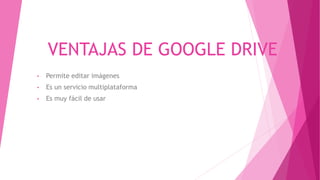 Este documento compara las ventajas y desventajas de Google Drive y Dropbox. Ambos servicios son multiplataforma y fáciles de usar, pero Dropbox permite compartir archivos y tiene capacidad limitada de almacenamiento, mientras que para acceder a Google Drive se necesita internet y otras personas pueden ver las páginas que utilizaste. Una desventaja de Dropbox es que solo se pueden sincronizar archivos dentro de él y no se puede trabajar simultáneamente en un archivo duplicado.