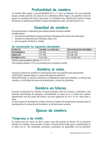 El documento describe los métodos para tratar las semillas antes y durante la siembra para producir plantas en un vivero. Se recomienda realizar ensayos de corte de semillas para determinar la densidad de siembra. También se sugiere estratificar las semillas en agua y luego en una heladera para lograr una germinación rápida y pareja. Existen diferentes métodos y épocas de siembra, así como consideraciones sobre la profundidad, densidad, riego y desmalezado de las plántulas.