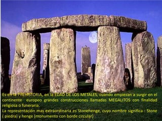 Stonehenge es un monumento megalítico construido entre el 2200 a.C. y el 1500 a.C. en Inglaterra que consiste en grandes bloques de piedra ordenados en círculos. Se cree que Stonehenge se usó como un observatorio astronómico y un lugar de reunión ritual relacionado con el culto solar.
