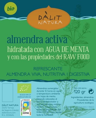 Este documento presenta cuatro variedades de almendras activas hidratadas con diferentes ingredientes y procesadas según los principios del raw food. Cada variedad describe el ingrediente de hidratación utilizado (agua de cebolla, menta, ajo o mar), el proceso de hidratación de 12 horas y deshidratación a 42°C, y sus propiedades nutritivas.