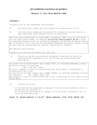 Este documento presenta 4 problemas relacionados con química analítica y orgánica. El primer problema incluye cálculos de pH de varias disoluciones. El segundo trata sobre análisis gravimétrico de hierro mediante valoración redox. El tercer problema involucra cálculos termodinámicos para una reacción de equilibrio. El cuarto problema identifica una sustancia orgánica importante y presenta cálculos sobre su estructura y propiedades.