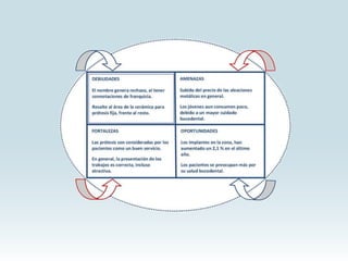 El documento presenta un laboratorio dental llamado almiDent que busca suplir las necesidades de la comunidad a través de prótesis dentales, aparatos de ortodoncia y otros servicios dentales de alta calidad a precios competitivos. El objetivo general es desarrollar actividades técnicas y dentales para proporcionar prótesis precisas utilizando tecnología avanzada. La visión es consolidarse como una de las empresas líderes en trabajos dentales para el 2015 a través de la máxima calidad, excelente personal y tecnología