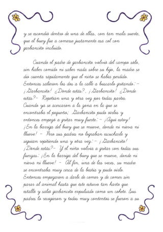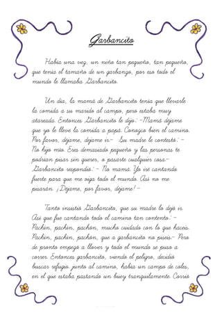 Garbancito es un niño tan pequeño que insiste en llevarle la comida a su padre en el campo cantando. Sin embargo, una tormenta sorprende a Garbancito y se esconde dentro de una col, siendo comido por un buey. Sus padres lo buscan desesperadamente hasta que lo escuchan gritar desde el interior del buey. Alimentan al buey hasta que estalla y Garbancito es liberado, prometiendo obedecer a su madre en el futuro.