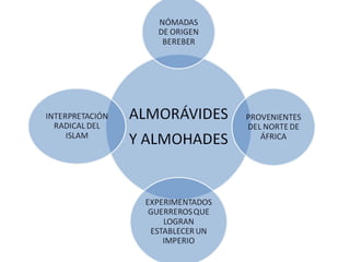 Los almorávides y almohades dominaron Al-Andalus desde el norte de África en los siglos XI y XII. Los almorávides unificaron Al-Andalus en el siglo XI tras la fragmentación del Califato Omeya, pero su imperio cayó en 1140 dando lugar a un nuevo periodo de taifas. Los almohades invadieron en 1147 e integraron de nuevo Al-Andalus en un imperio norteafricano, aunque su dominio terminó con su derrota frente a los reinos cristianos en la bat