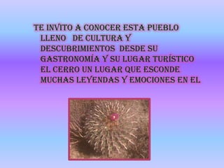 Este pueblo ofrece mucha cultura y descubrimientos a través de su gastronomía y un lugar turístico conocido como el cerro, el cual esconde muchas leyendas e historias.