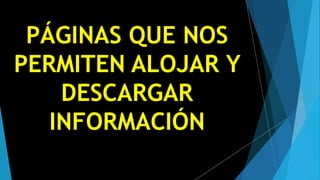 Este documento describe siete páginas web populares para alojar y descargar archivos de forma gratuita: 4shared, MediaFire, FileServe, ADrive, WeTransfer, FileHosting y DepositFiles. Explica brevemente las características y capacidades de cada una. También menciona que los "cyberlockers" se han vuelto una opción popular para intercambiar archivos en línea debido a su facilidad de uso y almacenamiento barato. En conclusión, estos servicios son útiles más allá de la piratería y también sirven para copias