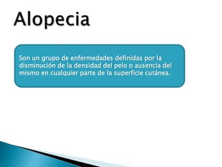 Las alopecias se definen por la disminución o ausencia del pelo en la piel. Pueden ser cicatrizales, causadas por daño al folículo piloso, o no cicatrizales, debidas a la miniaturización del folículo. La alopecia androgénica es la más común y se debe a factores genéticos y androgénicos. La alopecia areata produce placas alopécicas asintomáticas que pueden asociarse a enfermedades autoinmunes. La alopecia telógena efímera