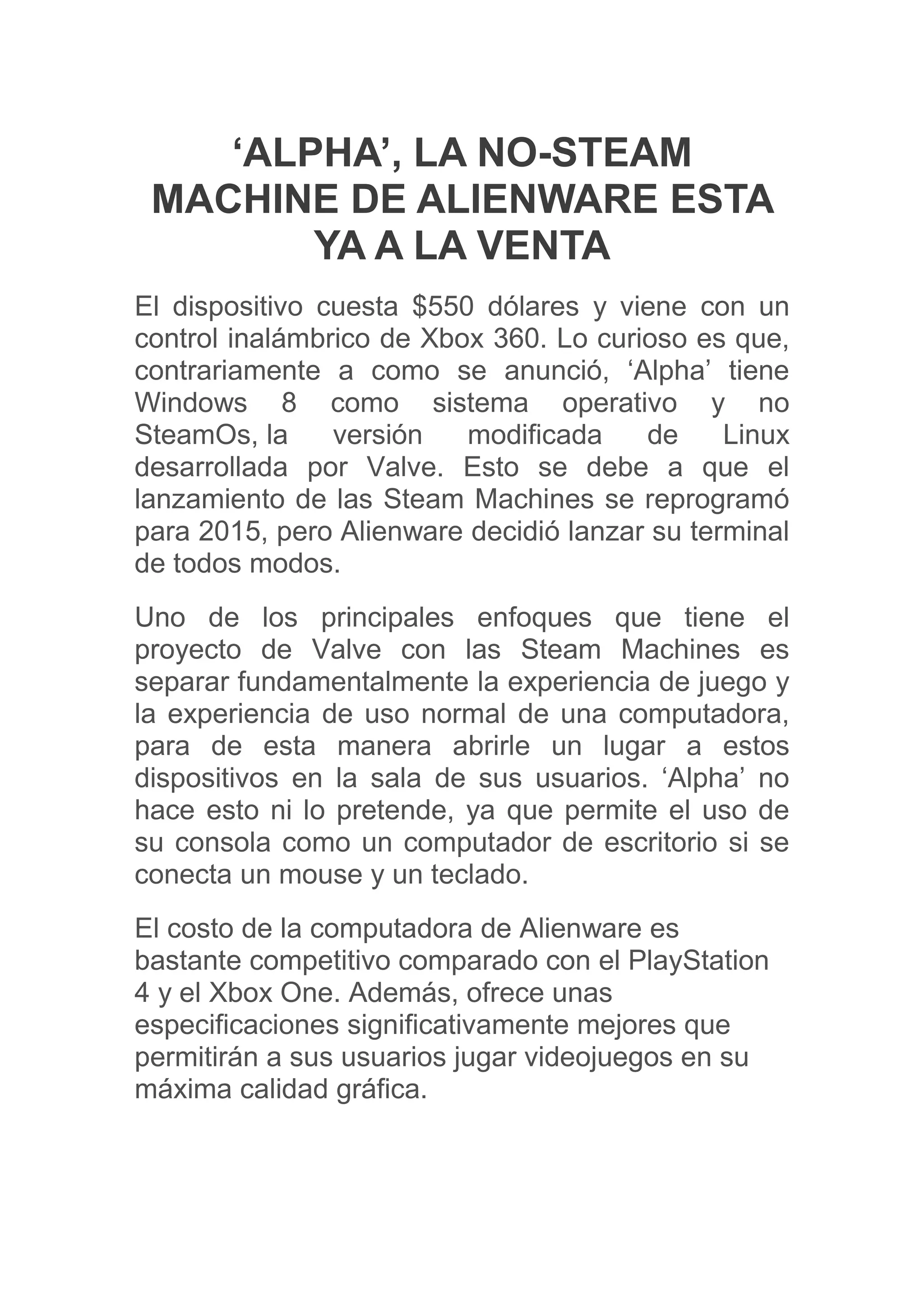 Alienware ha lanzado su consola de juegos 'Alpha' por $550 dólares, la cual viene con Windows 8 en lugar de SteamOS como se había anunciado originalmente. A diferencia de las Steam Machines, 'Alpha' permite usarla como una computadora de escritorio normal al conectar mouse y teclado. El dispositivo ofrece especificaciones superiores a PlayStation 4 y Xbox One a un costo competitivo.