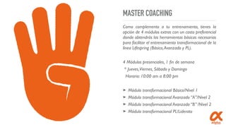 El documento ofrece información sobre un curso de herramientas avanzadas de coaching de 4 módulos que se llevará a cabo en Torreón y Durango. Incluye detalles sobre el programa, temario, costos e instructor. El curso busca entrenar a los participantes para facilitar sesiones de coaching individual y talleres.