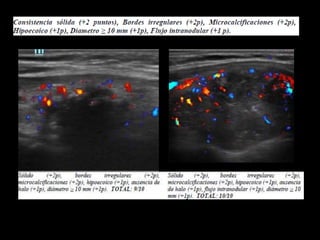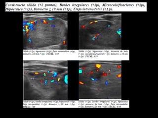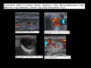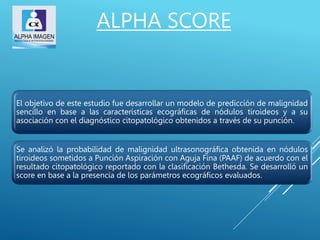 Este estudio desarrolló un modelo de predicción llamado "Alpha Score" para estimar el riesgo de malignidad en nódulos tiroideos basado en características ultrasonográficas. El estudio analizó 429 nódulos y encontró que características como hipoecogenicidad, solidez, bordes irregulares, microcalcificaciones y diámetro mayor a 10 mm estaban asociadas con malignidad. El modelo Alpha Score demostró ser una herramienta útil para estratificar el riesgo de malignidad en los nódulos y mejorar la