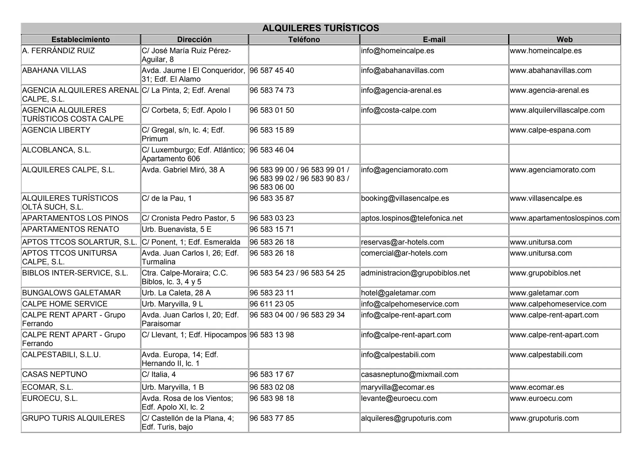 Este documento proporciona una lista de agencias de alquiler turístico en Calpe, España. Incluye el nombre de la agencia, su dirección, teléfono, correo electrónico y página web. En total se enumeran 41 agencias diferentes que ofrecen alojamientos de alquiler a turistas y visitantes en la ciudad de Calpe.