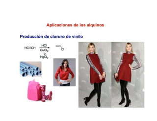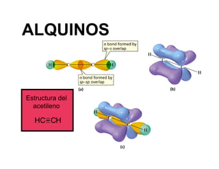 El documento describe las principales propiedades y reacciones de los alquinos y dienos conjugados. Los alquinos más pequeños y estables tienen 8 miembros en su anillo. Sus principales reacciones incluyen halogenación, hidrohalogenación, hidratación, hidroboración-oxidación, hidrogenación y ozonólisis. Los dienos conjugados presentan resonancia electrónica y sus reacciones de adición electrofílica dan preferencia al carbocatión más estable. La reacción de Diels-Alder es una cicloadición [4+2