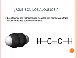 Los alquinos son hidrocarburos alifáticos con al menos un triple enlace entre dos átomos de carbono. No son solubles en agua pero sí en solventes orgánicos. Sus puntos de ebullición son mayores que los alcanos y alquenos equivalentes. Reaccionan con hidrógeno para formar alquenos o alcanos, y la primera molécula de halógeno se adiciona anti. La hidratación produce enoles que tautomerizan a aldehídos o cetonas. El acetileno y 1-butino se usan