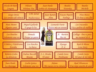 Este documento presenta una lista de canciones populares de diferentes artistas musicales en español e inglés de los años 60-70. La lista incluye canciones de Sergio Denis, J.M. Serrat, Nino Bravo, Los Iracundos, Matt Monro, Los Panchos, Nicola Di Bari, The Beatles, Juan Ramón, Dyango, Roberto Carlos, J. L. Perales, Camilo Sesto, Juan Pardo, Andrea Bocelli y Lucho Gatica.