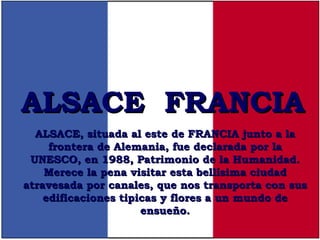 La región de Alsacia en Francia, situada junto a la frontera con Alemania, fue declarada Patrimonio de la Humanidad por la UNESCO en 1988 debido a su belleza, que incluye canales y edificios típicos rodeados de flores que transportan a los visitantes a un mundo de ensueño.