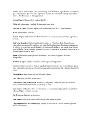 El altar de 7 niveles representa los 7 niveles que debe pasar el alma de un difunto para descansar en paz. Cada nivel tiene un significado y objetos específicos como fotos, sal, pan de muerto, comida preferida y una cruz hecha de semillas en el último nivel. El altar también incluye ofrendas como velas, olla con hierbas, papel picado, flores, agua e imágenes religiosas para guiar y bendecir a las almas.