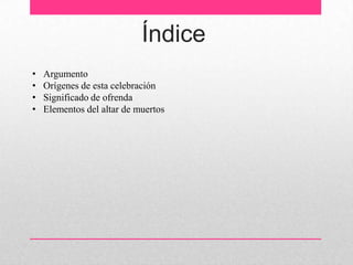 El documento describe las tradiciones del Día de Muertos en México, en particular el significado del altar de Día de Muertos. Explica que el altar es una forma de mantener contacto y recordar a los seres queridos fallecidos, poniendo ofrendas para ellos. Además, señala que los orígenes de la celebración se remontan a las culturas mesoamericanas como los aztecas y mayas, y que actualmente se celebra el 2 de noviembre coincidiendo con el Día de los Fieles Difuntos católico.