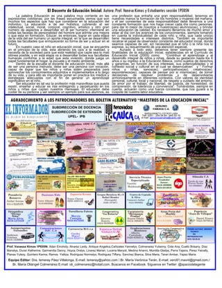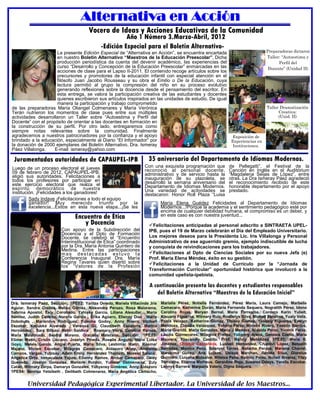 Este documento resume el boletín "Alternativa en Acción" del curso "Desarrollo y Concepción de la Educación Preescolar" en la Universidad Pedagógica Experimental Libertador. El boletín incluye artículos sobre los precursores de la educación infantil como Juan Jacobo Rousseau, talleres impartidos por las preparadoras, y experiencias de las estudiantes en instituciones educativas. Finalmente, agradece a los patrocinadores por su apoyo a la educación y a la revista.