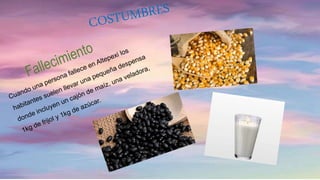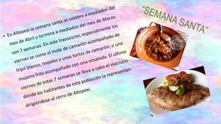 Altepexi se ubica en el sureste de Puebla. Sus tradiciones incluyen fiestas patronales para San Francisco de Asís y San Juan Bautista, donde se realizan misas, juegos pirotécnicos y bailes. Los quince años y bodas duran varios días con platillos típicos como el mole de guajolote. Los habitantes usan ropa tradicional como camisas bordadas para las mujeres y calzones anchos de manta para los hombres. La gastronomía se caracteriza por moles, barbacoa, tortas de pan de