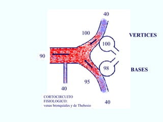 Este documento describe las alteraciones en la relación entre la ventilación (V) y la perfusión (Q) en los pulmones. Explica que una relación V/Q normal es de 1, mientras que una relación disminuida puede ser tipo cortocircuito (V/Q=0) o con una relación menor a 1. También describe cómo un aumento de la relación V/Q puede ocurrir y los efectos de la administración de oxígeno en diferentes trastornos V/Q.