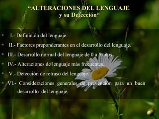 El documento describe el desarrollo normal del lenguaje en niños de 0 a 5 años y las alteraciones del lenguaje más comunes. Explica que el lenguaje se desarrolla en etapas y depende de factores como la audición, maduración neurológica y estimulación lingüística. Las alteraciones incluyen retrasos del lenguaje, trastornos como tartamudez y afasias. También proporciona ejercicios y estrategias para estimular el desarrollo del lenguaje oral en niños.